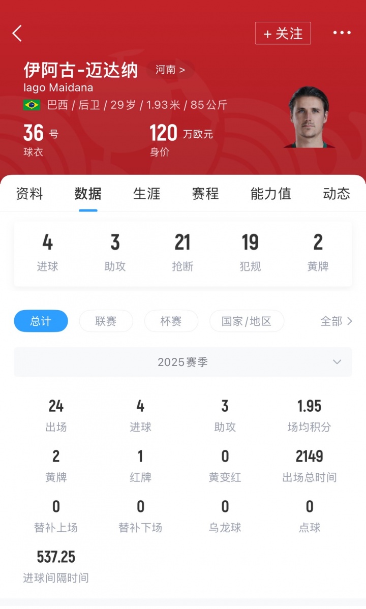 迈达纳现年29岁,巴西后卫,身高1米93。迈达纳前年2月目田身加盟河南,本赛季代表球队出场24次,孝顺4球3助。现在他德回身价为120万欧元。