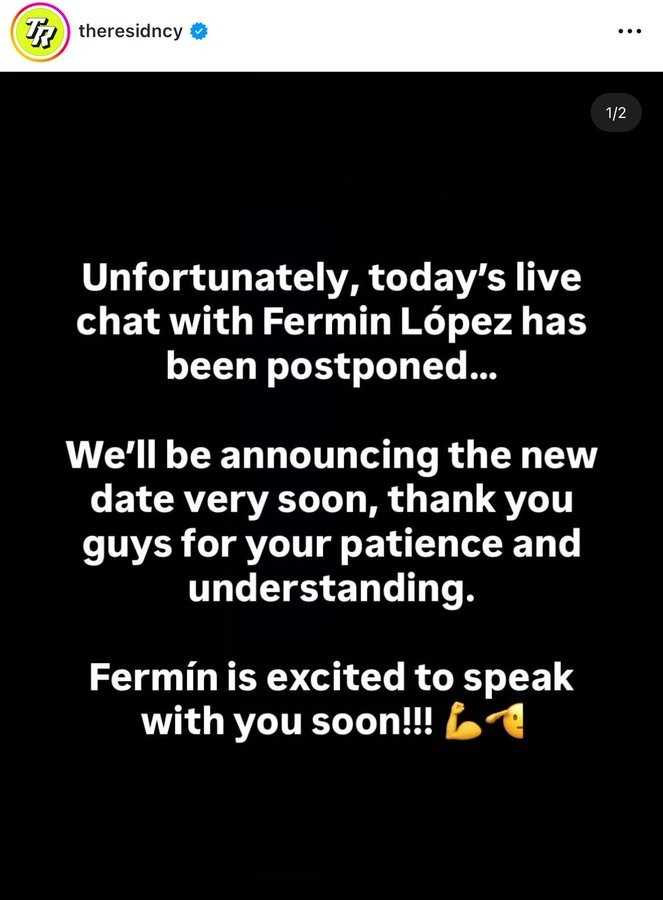 蓝本费尔明今天将进入外交媒体平台The Residency的直播对话活动,但平台方面默示活动照旧被推迟,并默示很快会晓喻新的活动日历。