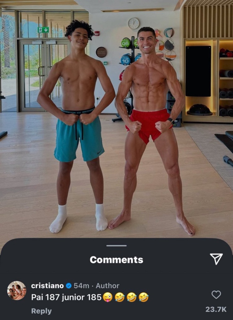尔后,在X上领有1.7万粉丝的账号ActuCR7发布了一张图片,上头泄漏C罗在此前的INS动态底下辩驳了,他暗示我方1.87米,而迷你罗则是1.85米。