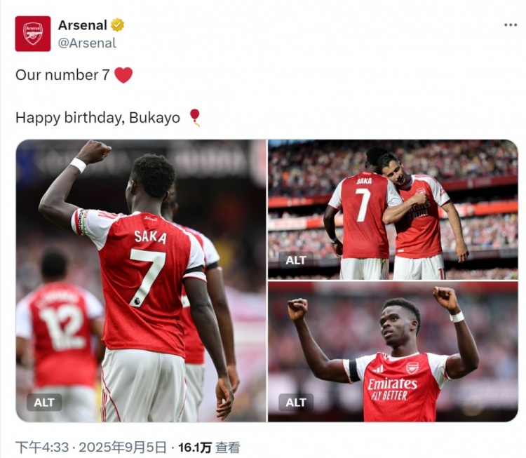 9月5日讯 今天是萨卡的24岁生辰,阿森纳为他奉上祝愿。