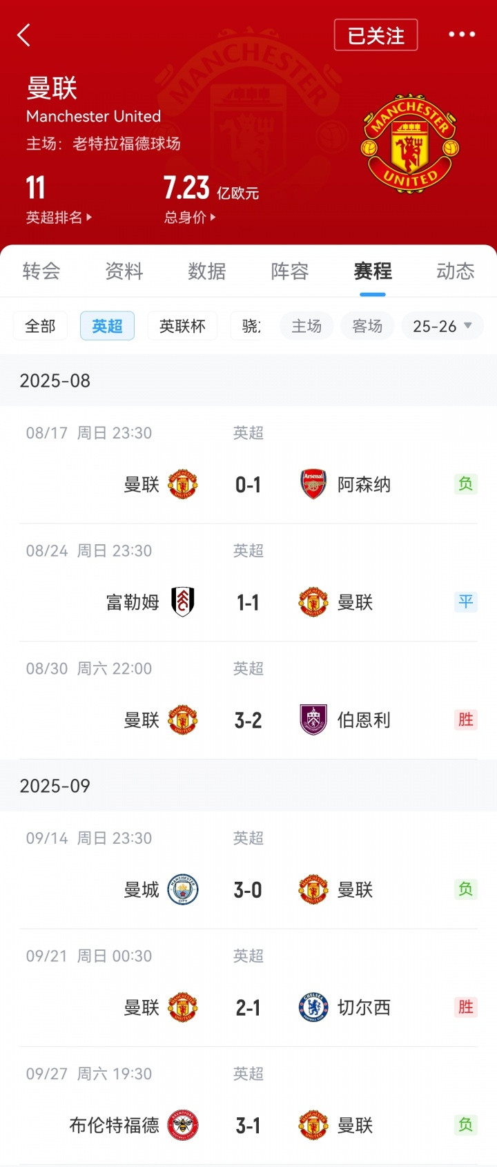 直播吧09月27日讯曼联开局2胜1平3负,6轮7分追平队史英超最差开局。