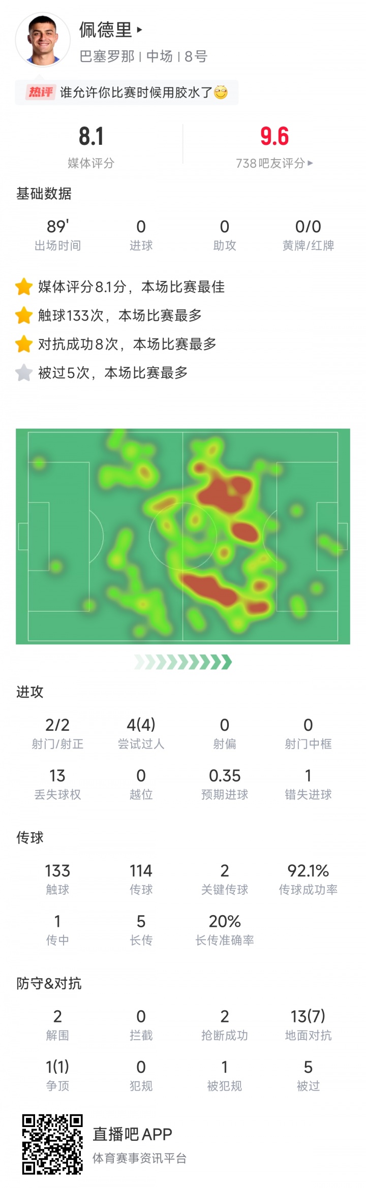 佩德里本场比赛依旧是孝敬极为逆天的数据。133次触球冠绝全场,这其中他有4次过东说念主一起告捷,14次抗争8次告捷,114次传球92.1%告捷率,2要津传球2突围2抢断。5次被过是他唯独的劣势数据。热门图笼罩统统中场的佩德里,已成巴萨不成或缺的引擎。