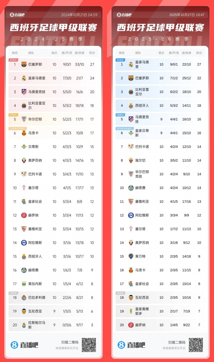 排行互换!前年开局巴萨9胜1负3分领跑,现皇马开局9胜1负5分领跑