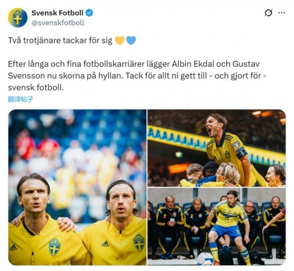 瑞典足协官方:前瑞典国脚埃克达尔、古斯塔夫·娴雅松退役