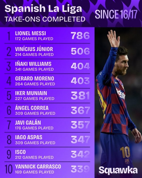 16-17赛季以来西甲过东谈主榜:梅西786次居首,维尼修斯506循序二
