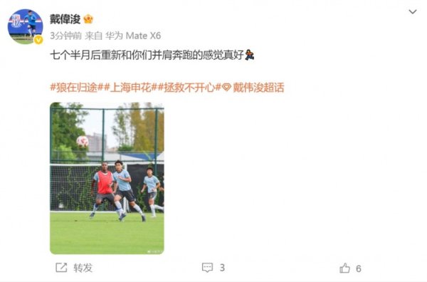 9月18日讯 申花球员戴伟浚更新社媒,晒出进入球队合练的相片。 在赛季前上海申花vs天津津门虎的热身赛中,申花中场戴伟浚际遇左膝前十字韧带断裂的重伤,他在2月汲取手术后驱动进行康复。 二次转会窗口,申花为戴伟浚在中超补报名,而在球队上轮对阵泰山的赛前,主帅斯卢茨基显现,戴伟浚本赛季复出可能比拟肃肃。 今天,戴伟浚在个东谈主社媒晒出一张他进入球队合练的相片,并配文:七个半月后再行和你们并肩奔波的嗅觉真好。......查看更多