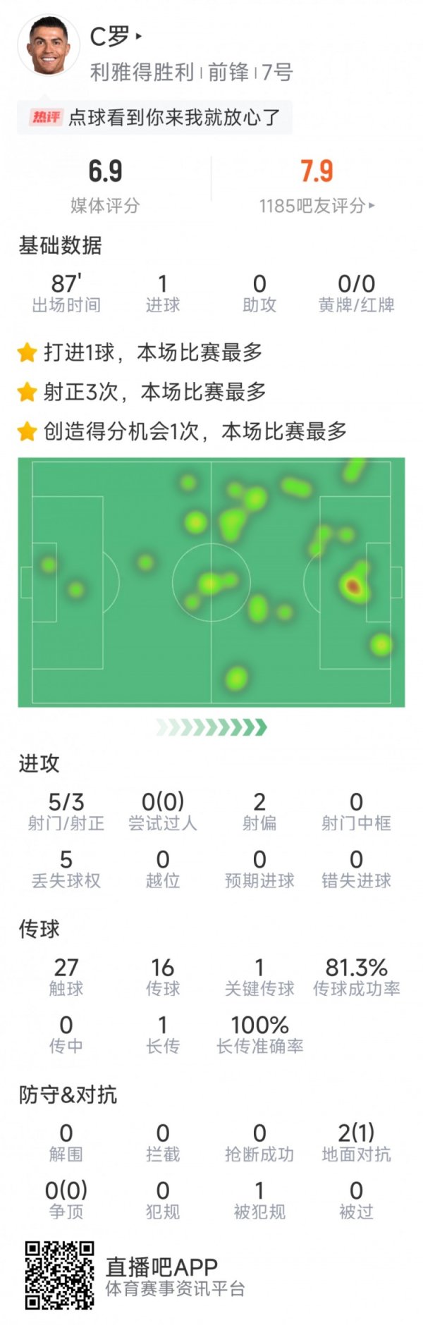 C罗本场数据:点射破门迎得手生存百球,5射3正,1关键传球