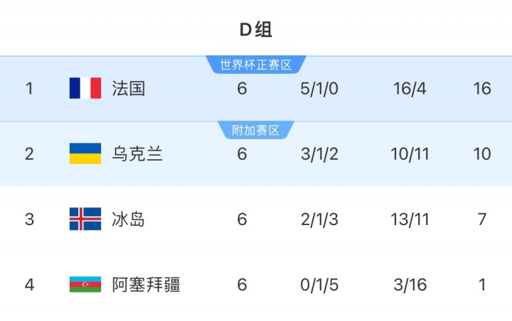 世欧预D组:法国6轮不败16分居首,乌克兰末轮胜冰岛锁定第2