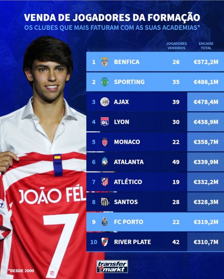 本世纪出售青训球员收入榜:本菲卡、葡萄牙体育、阿贾克斯前三