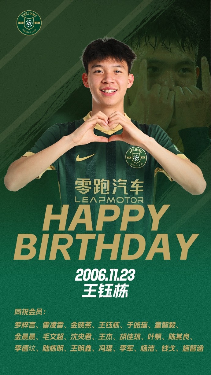 11月23日讯 今天是王钰栋19岁寿辰,浙江队官方发文送道喜。
