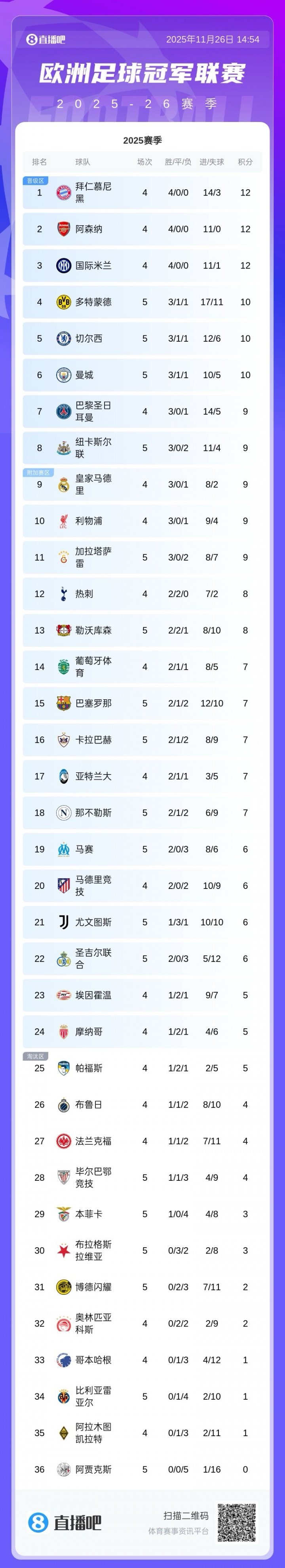 在当今的欧冠积分榜上,4支英超球队暂列前8晋级区,而西甲传统权门“皇萨竞”则暂列晋级区除外,毕尔巴鄂、比利亚雷亚尔致使位列淘汰区。
