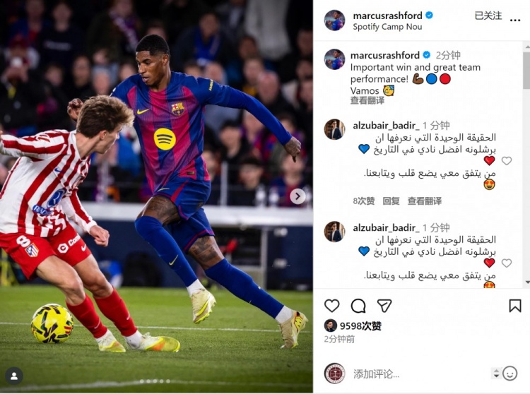 拉什福德社媒晒出比赛像片,并写说念:“进犯的顺利,出色的团队发扬。加油!”