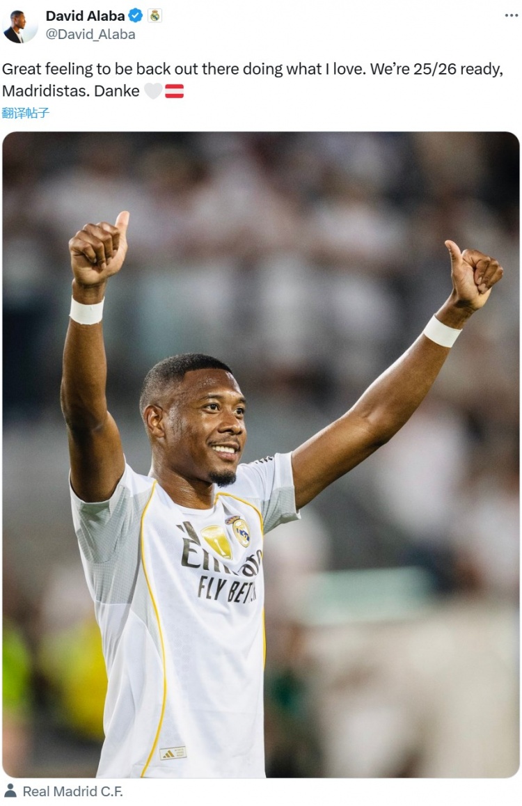 阿拉巴晒出我方像片,并配文写谈:“能重返赛场作念我方醉心的事情,嗅觉相配棒。咱们依然为25-26赛季作念好准备,感谢马德里球迷们。”