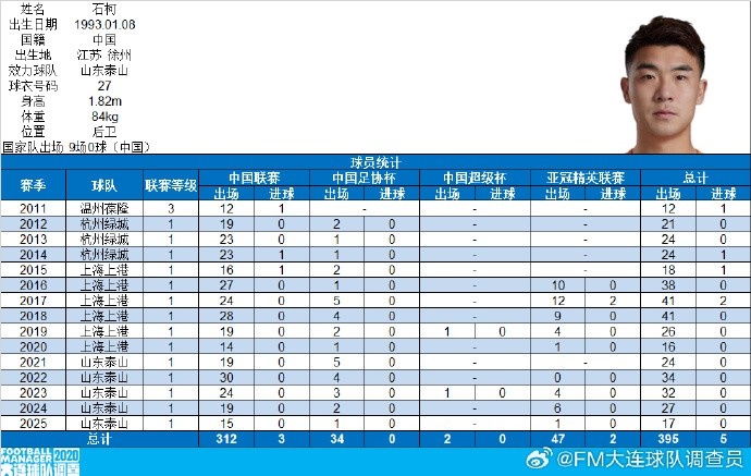 8月17日讯 据博主“FM大连球队探问员”统计,山东泰山球员石柯在泰山客场对阵新鹏城的比赛中,完成个东说念主在中国顶级联赛出场300场的里程碑,成为第52位结束此项建立的球员,93年岁段第1东说念主。