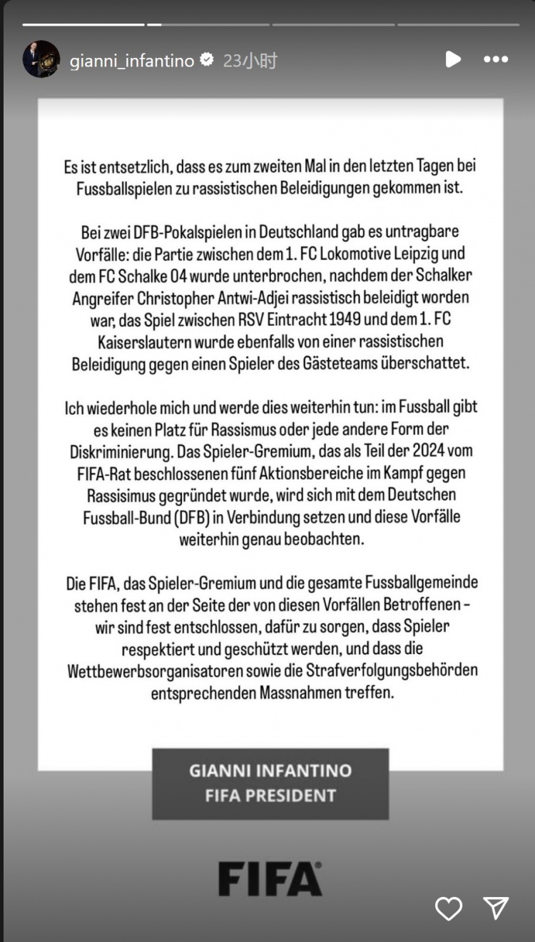 8月19日讯凯 海外足联主席因凡蒂诺更新社媒动态,对德国杯种族厌烦事件发声。