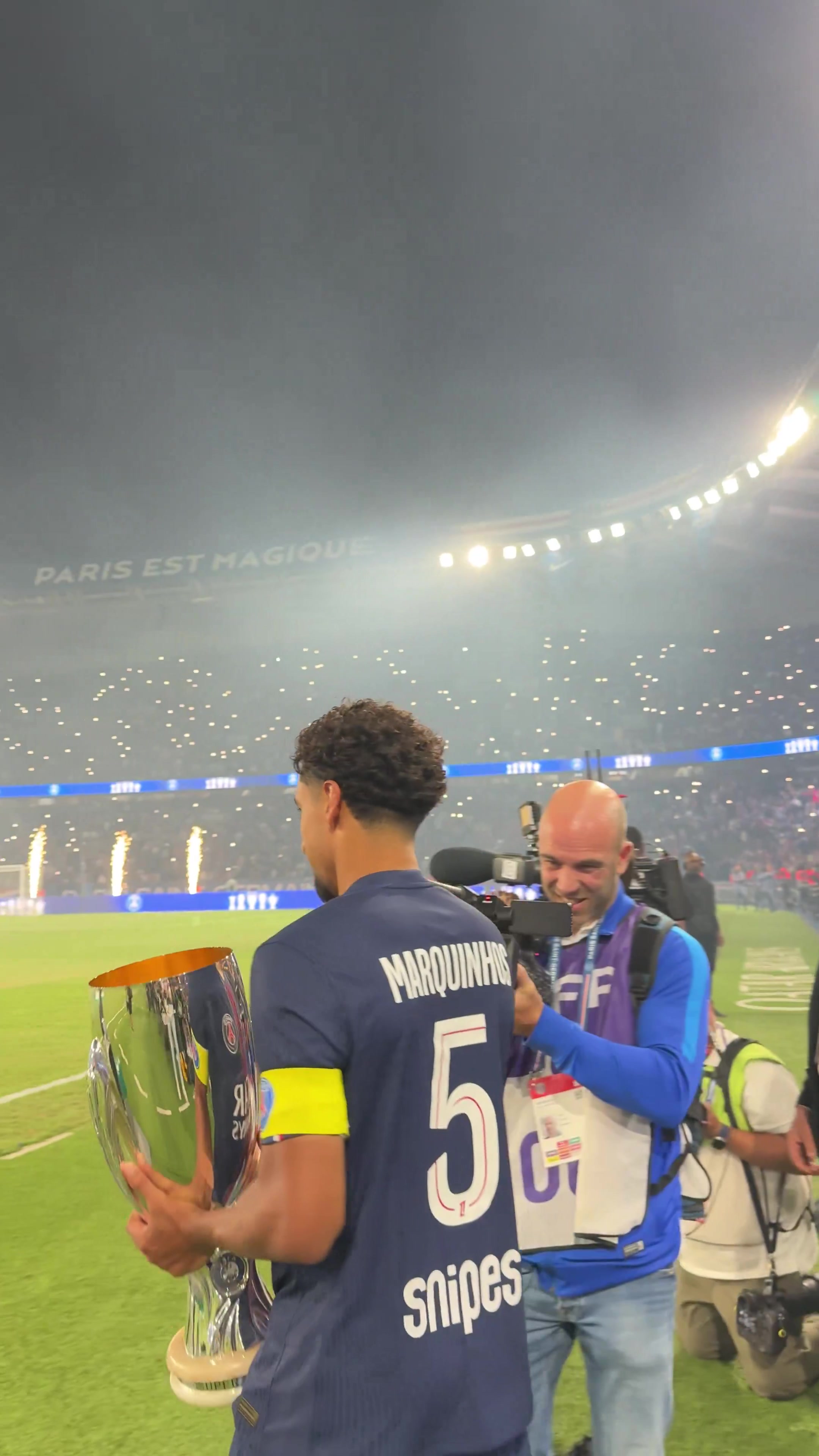 巴黎在王子公园球场展示了球队上赛季取得的奖杯,以及欧洲超等杯奖杯,俱乐部官方社媒晒出视频,配文:“咱们的冠军。”