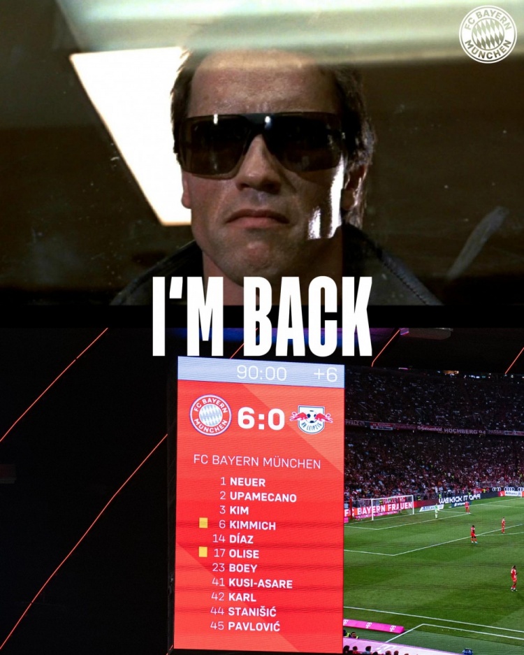 拜仁官方社媒晒出带有6-0比分牌的斥逐者主题海报,配文:“I'M BACK。”