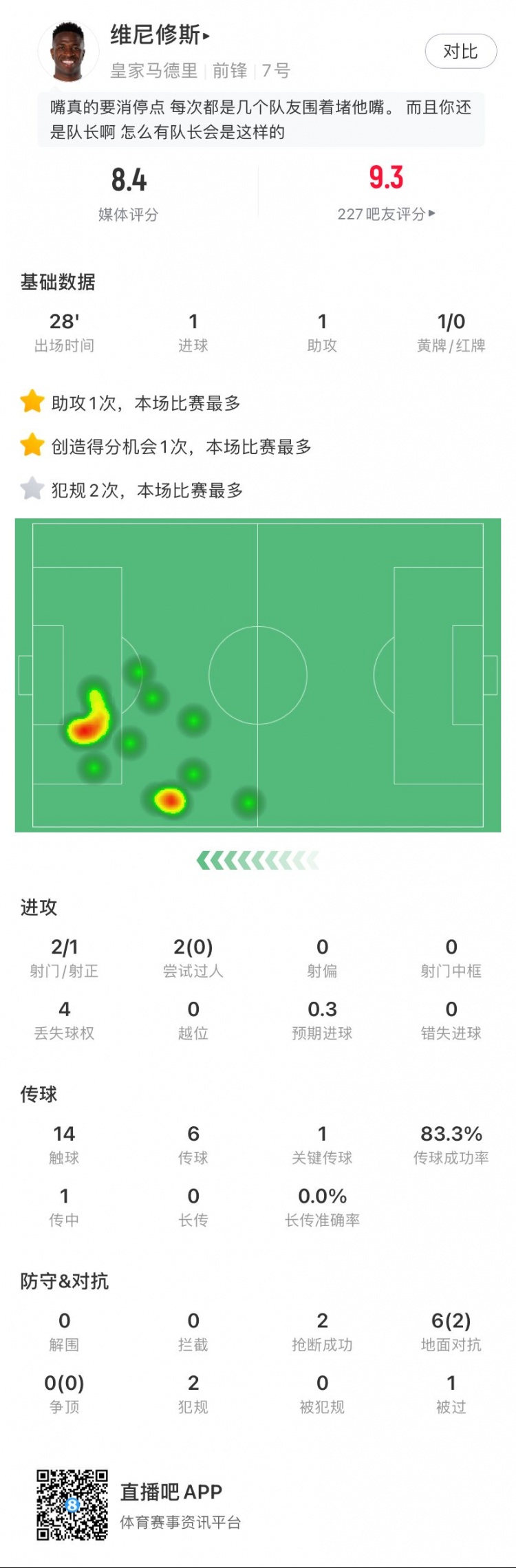 替补传射!维尼修斯全场数据:1进球1助攻,1次要道传球,评分8.4