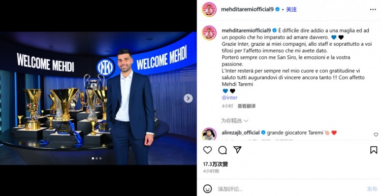 “海外米兰将永久留在我心中。带着谢意之情,我向你们通盘东谈主告别,并祝贺你们当年得回更多荣誉!满怀心扉地这样作念。——梅赫迪-塔雷米。”