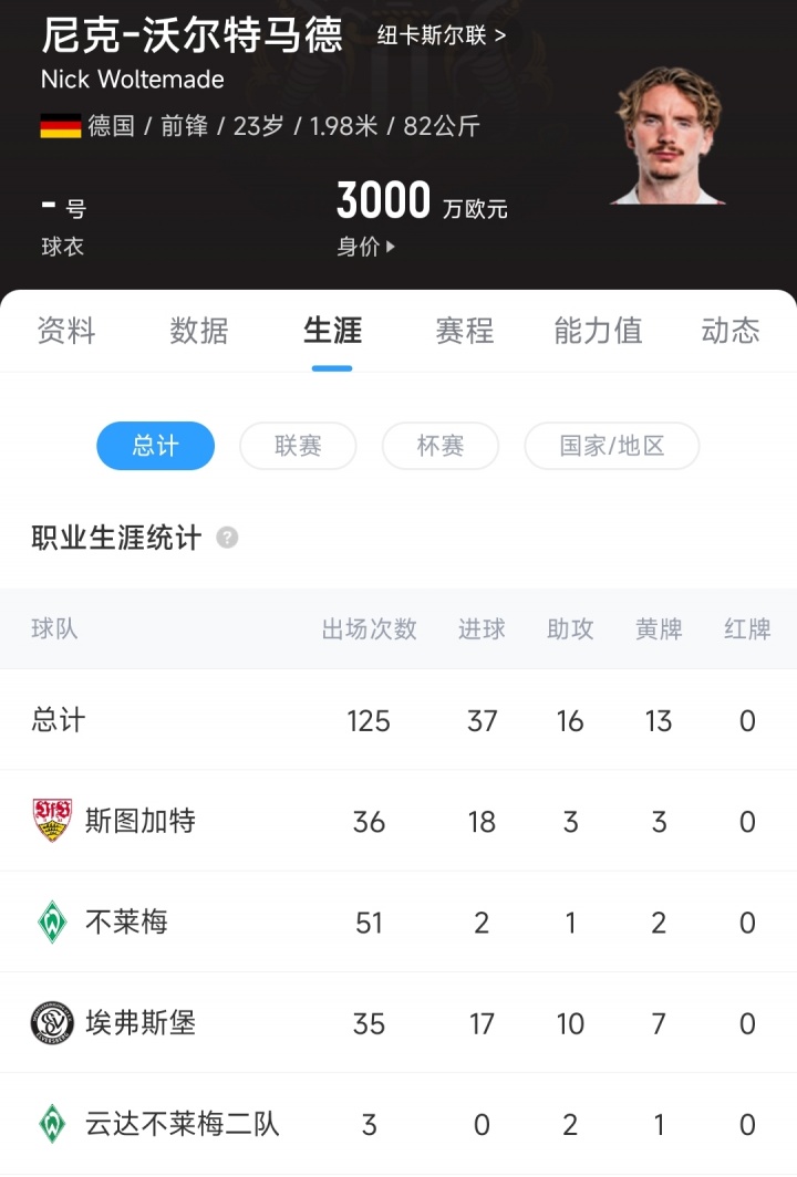 08月30日讯 官方音信,纽卡斯尔从斯图加特签下23岁的沃尔特马德,德转数据显露,沃尔特马德的转会费为8500万欧元。