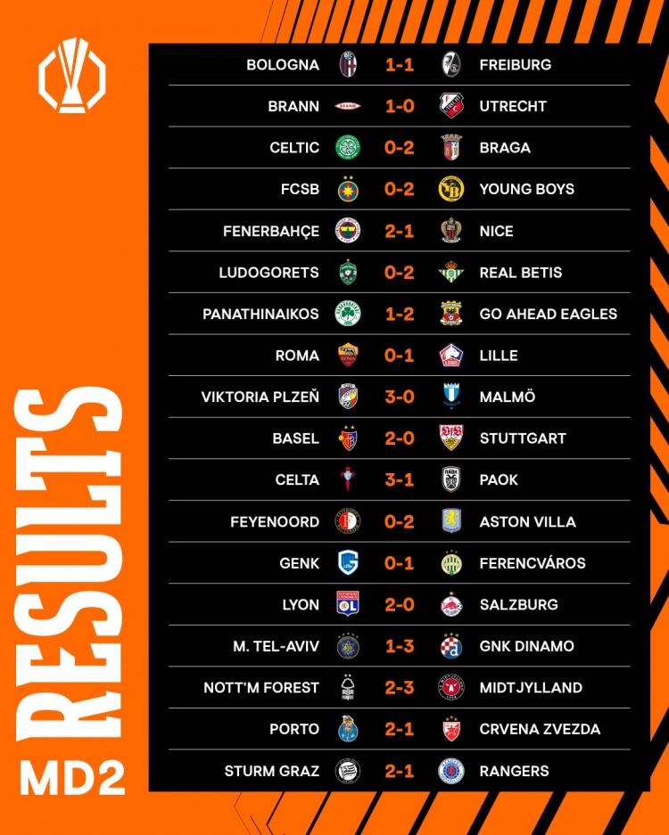 欧联杯联赛阶段第二轮比赛成果: