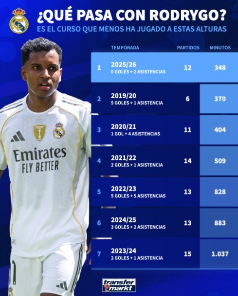 11月8日讯 尽管皇马主帅阿隆索屡次在新闻发布会上强调罗德里戈是球队阵中紧要一员,但数据却浮现了饱和不同的情况。在要紧端,独一恩德里克和贡萨洛-加西亚比他出场本领更少。事实上,这是他加盟皇马以来前15场比赛出场本领最少的一个赛季。 德国转会市集清点了罗德里戈加盟皇马后7个赛季同时出场数据,本赛季他尽管出战了12场比赛,但出场本领仅为348分钟。在这个经过中,他送出了两次助攻。 以下为罗德里戈加盟皇马后赛季前15场出场本领数据: 2025-26赛季(12场0球两助):348分钟......查看更多