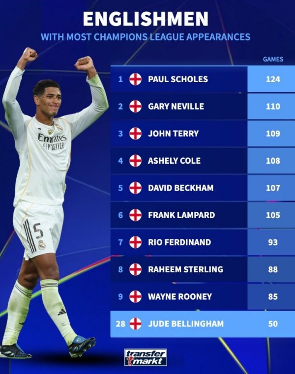 11月5日讯 在本轮欧冠,利物浦1-0打败皇马。贝林厄姆完成生计50场欧冠里程碑,德转也盘货了英格兰球员欧冠出场次数榜,具体如下: 1、斯科尔斯 124场 2、加里-内维尔 110场 3、特里 109场 4、阿什利-科尔 108场 5、贝克汉姆 107场 6、兰帕德 105场 7、费迪南德 93场 8、斯特林 88场 9、鲁尼 85场 ..... 28、贝林厄姆 50场......查看更多
