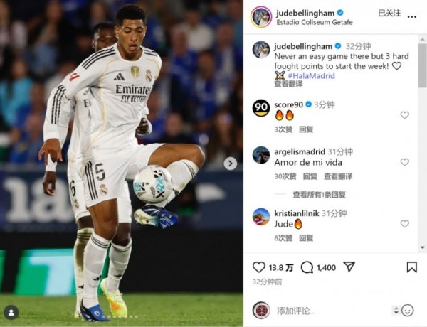 贝林社媒庆祝收效:在这里比赛从来齐不爽气,以3分开启新的一周