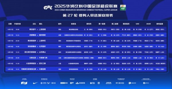 10月17日讯 中国足协公布中超第27轮裁判安排,孟祥昆王法浙江vs泰山,麦麦提江王法玉昆vs津门虎。 附中超第27轮裁判安排: 10月17日18:00 青岛海牛vs上海海港 主裁判:王竞 VAR:甄伟 10月17日19:35 成都蓉城vs梅州客家 主裁判:邢琦 VAR:顾春含 10月17日20:00 青岛西海岸vs上海申花 主裁判:甘树然 VAR:李海新 10月18日16:00 深圳新鹏城vs北京国安 主裁判:金京元 VAR:张杨帆 10月18日19:35 浙江队vs山东泰......查看更多