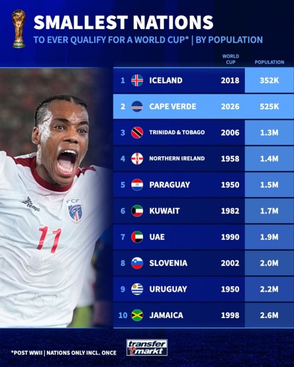 进入宇宙杯东谈主口最少国度:冰岛35.2万居首,佛得角52.5万次席