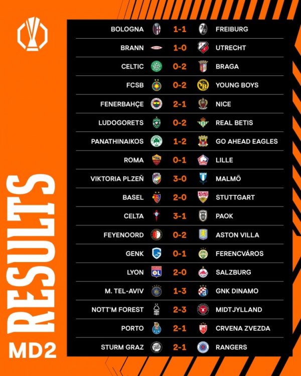 欧联杯第二轮赛果:罗马0-1里尔、费内巴切2-1尼斯,维拉里昂取胜