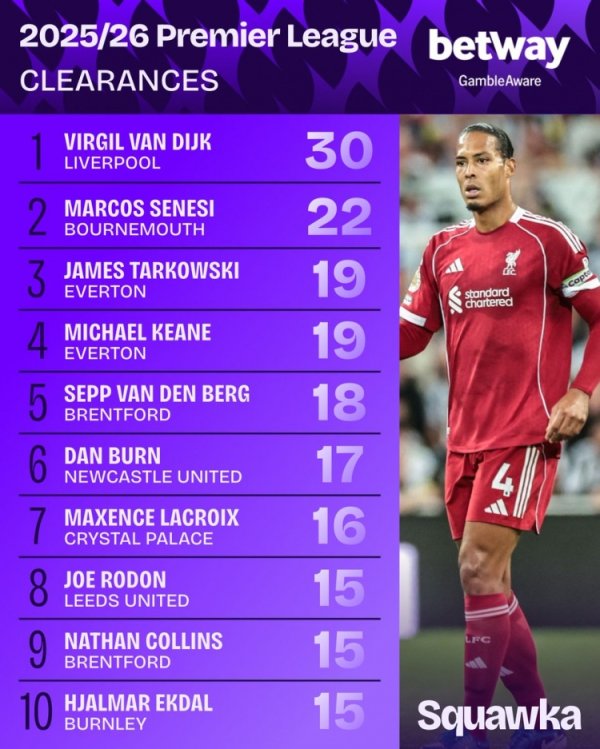 本赛季英超突围榜:范迪克30次居首,塞内西22挨次二