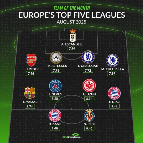 whoscored五大联赛8月最好阵:凯恩、亚马尔领衔,N-佩佩在列