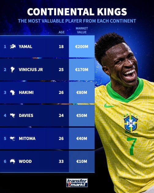 8月23日讯 德国转会市集列出了各大洲身价最高的球员,以及各大洲的球员总身价。 各大洲身价最高球员: 欧洲——亚马尔(18岁)——2亿欧 南好意思洲——维尼修斯(25岁)——1.7亿欧 非洲——阿什拉夫(26岁)——8000万欧 北好意思洲——戴维斯(24岁)——5000万欧 亚洲——三笘薫(28岁)——4000万欧 大洋洲——伍德(33岁)——1000万欧 各大洲球员总身价排行(有德回身价的球员): 欧洲(42151东说念主)——392.7亿欧 南好意思洲(12111东说念......查看更多