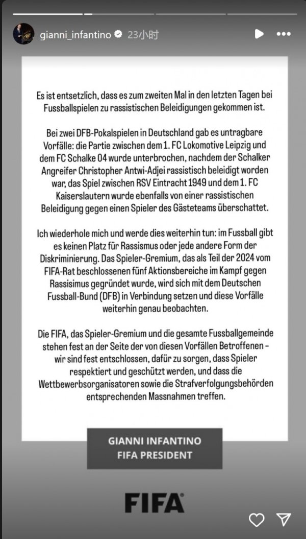 8月19日讯凯 海外足联主席因凡蒂诺更新社媒动态,对德国杯种族厌烦事件发声。 沙尔克对阵莱比锡火车头的德国杯首轮比赛,沙尔克球员阿杰伊际遇种族厌烦。 因凡蒂诺社媒写说念:“最近几天,足球比赛中再次发生种族办法侮辱事件,这令东说念主震恐。 在两场德国杯比赛中,发生了令东说念主无法禁受的事件——莱比锡火车头对阵沙尔克的比赛中,沙尔克先锋阿杰伊遭到种族办法侮辱,导致比赛中断;RSV埃因特对阵凯泽斯劳滕的比赛也因客队球员遭受种族办法侮辱而蒙上暗影。 我再次重申,并将持续重申——足球界......查看更多